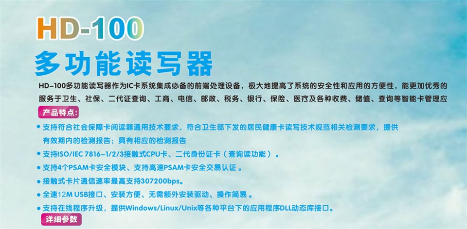 華大HD100身份證社保閱讀器產(chǎn)品是一款功能強大的身份證讀卡器,它采用智能技術(shù),可以一秒鐘完成身份證的采集和信息的讀取,識別速度快,準確率高。該產(chǎn)品廣泛應(yīng)用于公安、交通、鐵路、民航、銀行、學(xué)校等企事業(yè)單位。