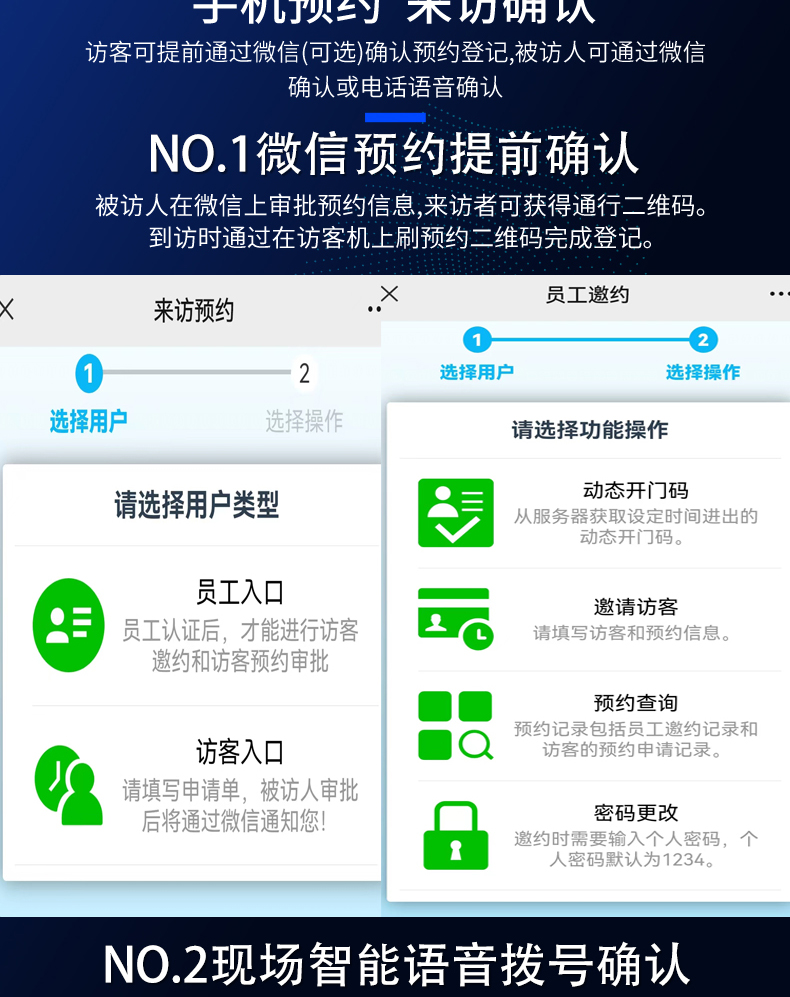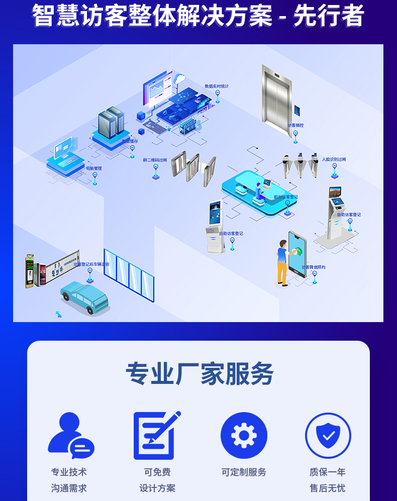 1.人證核驗(人證合一)? 2.電話撥號? 3.門禁聯動? 4.人行通道閘機? 5.電梯聯動??? 6.網絡攝像頭全景拍照? 7.車輛車牌識別控制系統? 8.訪客人車微信預約? 9.體溫檢測? 10.短信發送、確認