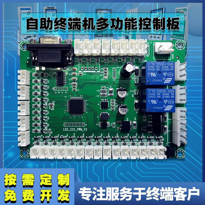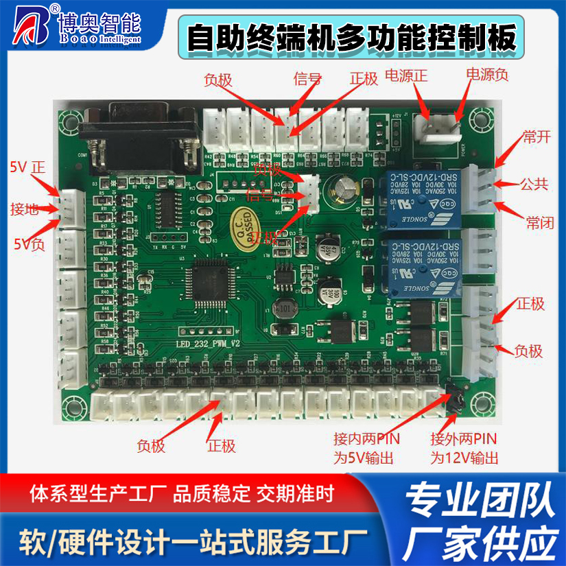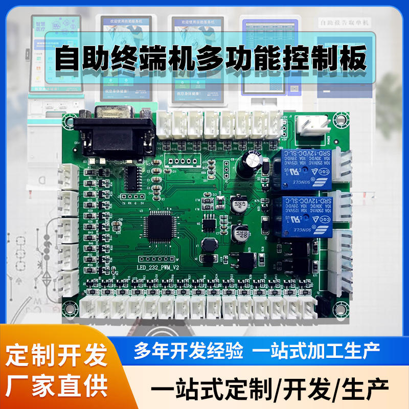 該產品是專為自助終端設備配套開發的一款終端機多功能控制模塊,可應用此模塊實現各模塊操作指示燈的提示控制、接收開關量的輸入上傳、繼電器常開、常閉輸出、PWM 輸出功能以及溫濕度檢測功能;