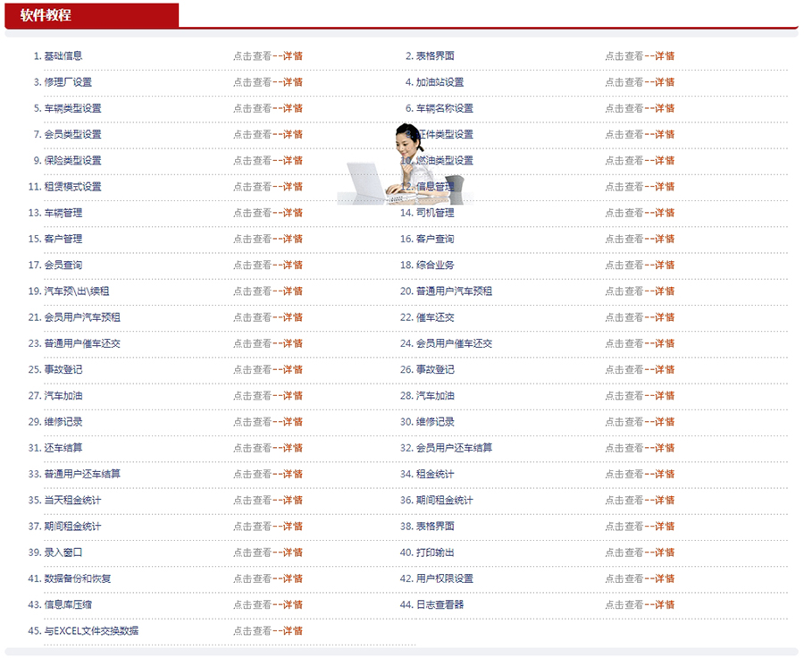 三、產品優勢 1. 操作快捷、方便 界面簡潔明了,操作流程清晰,降低用戶學習成本。 2. 性能高效、強大 系統經過嚴謹設計,性能穩定,可滿足大規模數據處理需求。 3. 使用易懂、易會 根據用戶實際需求進行功能設計,易于理解和掌握。 4. 全面管理 覆蓋車輛租賃業務全過程,助力企業實現精細化管理。 5. 強大輔助錄入功能 減少錄入工作量,提高工作效率,降低工作強度。 6. 靈活、專業的報表設計 滿足各類報表需求,助力企業數據分析與決策。 綜上所述,車輛租賃管理系統憑借其完善的功能、高效的性能和易用的操作,成為車輛租賃企業的不二之選。我們相信,通過使用本系統,企業將實現管理水平的全面提升,從而在激烈的市場競爭中立于不敗之地。