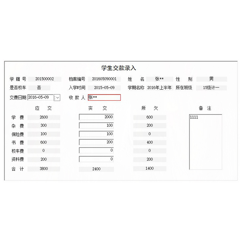 本文介紹了一款針對(duì)學(xué)校收費(fèi)管理的系統(tǒng)。該系統(tǒng)能全面協(xié)助學(xué)校管理學(xué)生各項(xiàng)費(fèi)用,包括學(xué)費(fèi)、書費(fèi)、資料費(fèi)、保險(xiǎn)費(fèi)、雜費(fèi)和校車費(fèi)。通過(guò)簡(jiǎn)單錄入學(xué)生基本信息,系統(tǒng)可自動(dòng)復(fù)制到交費(fèi)信息中,實(shí)現(xiàn)高效的數(shù)據(jù)匯總和統(tǒng)計(jì)。此系統(tǒng)上手快,靈活易用,適合各種學(xué)校財(cái)務(wù)人員使用。