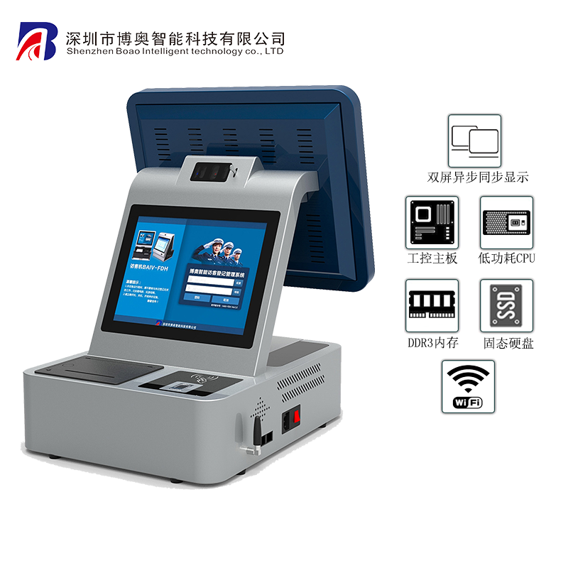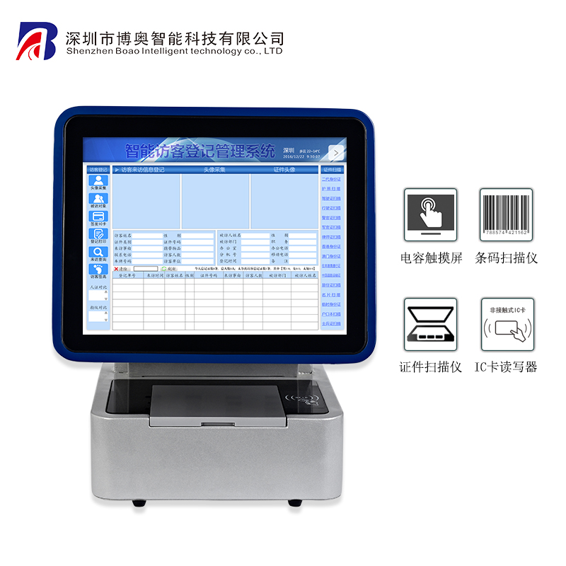 15寸雙屏智能訪客機(jī)BA-IVB1是我公司研新一代高端智能訪客登記管理設(shè)備,整機(jī)符合人體工程設(shè)計(jì),機(jī)身小巧,外形新穎、美觀、簡(jiǎn)潔,內(nèi)部模塊化設(shè)計(jì)、維護(hù)方便;采用多點(diǎn)電容觸摸屏設(shè)計(jì),點(diǎn)擊靈敏、操作方便,支持雙屏同步顯示和異步顯示,集成證件OCR掃描識(shí)別、身份證讀取,IC卡讀寫、人臉抓拍比對(duì)、指紋采集比對(duì)、條碼掃描、訪客單打印等功能,能夠迅速的完成訪客登記保存查詢工作。
